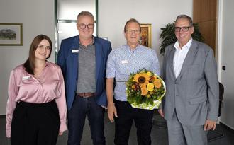 Erster Beigeordneter Andree Stein (rechts), Büroleiter Guido Göbel und Svenja Haas vom Personalrat gratulierten herzlich zum 40-jährigen Dienstjubiläum. (Bild: Melissa Gundlach)