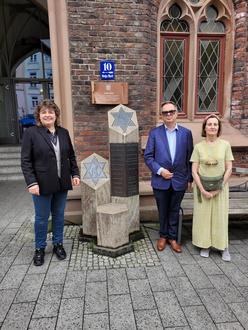 Gerald Stern und Schwester Betty (rechts) gedenken gemeinsam mit Stadtbürgermeisterin Melanie Leicher der Opfer des NS-Regimes in Montabaur. Gerald Stern setzte sich mehrere Jahre für das jüdische Mahnmal ein, das 2013 vor dem historischen Rathaus errichtet wurde.
