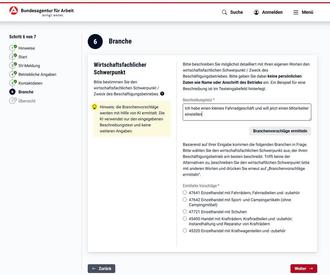 Die Arbeitgeber geben frei formuliert den wirtschaftlichen Schwerpunkt des Betriebs ein. Dieser Freitext wird von dem speziell dafür trainierten Sprachmodell verarbeitet und die KI ermittelt die fünf Wirtschaftsunterklassen, die inhaltlich am besten zu der Eingabe passen.