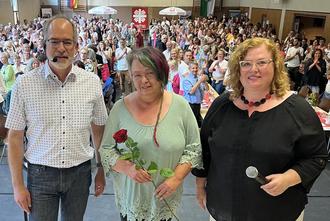 Beim Mitarbeiterfest des Caritasverbandes Westerwald-Rhein-Lahn wurden wieder zahlreiche haupt- und ehrenamtliche Mitarbeitende für ihre langjährige Treue ausgezeichnet. Die Mitarbeiterin mit der längsten Dienstzeit war Marietta Martinek (Mitte), Pflegefachkraft in der Sozialstation Montabaur-Wallmerod, der Caritasdirektorin Stefanie Krones (rechts) und Caritasdirektor Frank Keßler-Weiß (links) zum 45-jährigen Dienstjubiläum bei der Caritas gratulierten. Von den Kolleginnen und Kollegen im Saal der Arzbacher Limeshalle gab es dafür Standing Ovation.