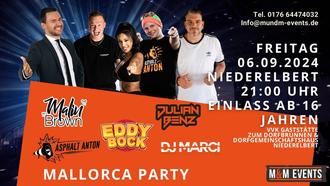 Beginnen werden wir traditionell am Freitag, den 06. September um 18.00 Uhr mit dem Aufstellen des Kirmesbaumes und anschließendem Fassanstich. Ab 21.00 Uhr beginnt die „Mallorcaparty“ mit DJ MARCI, ASPHALT ANTON, JULIAN BENZ; EDDY BOCK und MALIN BROWN.