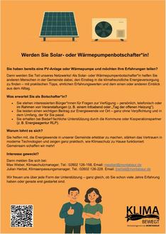 Weitere Infos unter: www.klima-bewegt.de „Bürgerinnen und Bürger - Solar- und Wärmepumpenbotschafter“.