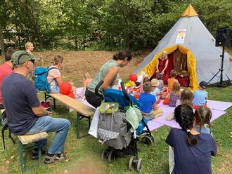 Zwei Mal versammelten sich kleine und große Märchenfans vor dem malerischen Tipi und lauschten dem Flötenspiel und den märchenhaften Geschichten, oft französischen Ursprungs, die Rita Maria Fröhle von der Märchenbühne Schudt vortrug.