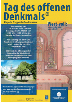 Ruppach-Goldhausen. Der Kapellenverein Ruppach-Goldhausen lädt hiermit herzlich in die Kapelle Goldhausen anlässlich des „Tag des offenen Denkmals®“ ein. Am 13.09. öffnen wir die Kapelle von 10 Uhr bis 20 Uhr und am 14.09. von 10 Uhr bis 18 Uhr. Am 13.09. wird um 18 Uhr in der Kapelle ein Eröffnungsgottesdienst mit anschließendem Sektempfang stattfinden. Dazu wird es in kleinen Gruppen eine kurze Führung in und um die Kapelle geben, in dem man einen beschaulichen Einblick in die baukulturellen Geschehnisse erhält.