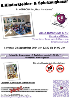 Wir starten in alter Frische, aber mit einem neuen Basartag – am Samstag in den 6. Kinderkleider-& Spielzeugbasar in Nomborn. Der Basar findet am Samstag, den 28.09.2024 in der Zeit von 12:30 bis 14:00 Uhr im „Haus Numburne“ mit dem Thema „Herbst und Winter“ statt. Solltest du aktuell Schwanger sein oder einen Gutschein von uns besitzen, laden wir dich mit einer Begleitperson bereits schon in der Zeit von