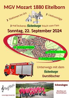 Am kommenden Sonntag findet unser diesjähriges Eckensingen statt. Wie in den letzten Jahren werden wir an drei verschiedenen Stationen im Ort je drei Lieder singen. Los geht es um 14:30 Uhr am alten Rathaus. Gegen 15:45 Uhr treten wir Ecke Nörrenpfad/ Steinstraße auf; der letzte Auftritt ist gegen 17:00 Uhr im Lärchenweg am Spielplatz. Natürlich wird es auch wieder leckeres gezapftes Bier vom Fass aus dem ‚Hachenburger Durstlöscher‘ geben. Ein gemütlicher Abschluss mit gegrillten Würstchen wird wie gewohnt am Gemeindehaus gemacht. Die Mozartler freuen sich über ihren Besuch.