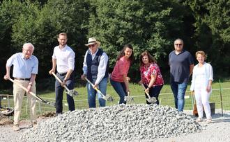 Symbolischer Spatenstich für das Neubaugebiet „Im Herberg II“ in Niederelbert. An den Spaten (v.l.) Ortsbürgermeister a.D. Willi Bode, Bürgermeister Ulrich Richter-Hopprich von der VG, Ortsbürgermeister a.D. Willi Müller, die Beigeordnete Anke Thome, die amtierende Ortsbürgermeisterin Carmen Diedenhoven, Peter Weis von der Artec Bauüberwachung und die Ortsbeigeordnete Dorothee Holly. (Bild: VG Montabaur / Christina Weiß)