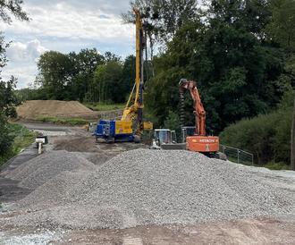 Das neue Dammbauwerk wird über dem Weiherhellbach errichtet. Das Gelände ist in dem Bereich steil und der Untergrund torfig-moorig. Um hier die Tragfähigkeit des Baugrunds zu erhöhen und damit das künftige Bauwerk zu stabilisieren, wurde ein besonderes Verfahren angewendet: die Rüttelstopfsäulen. In einem Raster von 2 x 2 Metern wurden mehr als 500 Säulen bis zu sieben Meter tief in die Erde getrieben. Jede Säule hat einen Durchmesser von 50 Zentimetern. So werden sie hergestellt: Zunächst wird ein Loch ins weiche Erdreich gebohrt und zwar so tief, bis der Bohrer auf festen Untergrund stößt. Dann wird nach und nach Füllmaterial aus Schotter und Splitt eingefüllt und mit dem Rüttler verdichtet. Es entstehen unterirdische Säulen, die auch ohne Beton genügend Festigkeit geben, um den Baugrund zu stabilisieren. Diesen Spezialtiefbau hat die Firma Bauer aus Schrobenhausen ausgeführt.