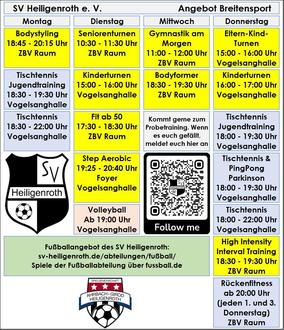 Der SV Heiligenroth konnte sein umfassendes Angebot wieder erweitern. Ab 01. Februar startet das Rückenfitnesstraining, welches jeden ersten und dritten Donnerstag im Monat ab 20:00 Uhr im ZBV Raum in der Vogelsanghalle in Heiligenroth durchgeführt wird. Kommt einfach vorbei, eine vorherige Anmeldung ist nicht nötig. Mitzubringen sind lediglich Sportkleidung, Trainingsmatte und Getränk.