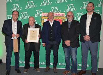 Günther Hübinger wurde vergangene Woche durch den Fußballverband Rheinland e.V. mit Präsident Gregor Eibes und Ehrengast Rudi Völler für sein Lebenswerk ausgezeichnet.