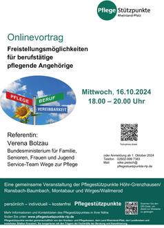 Zu diesem Thema haben die Pflegestützpunkte im unteren Westerwald Verena Bolzau vom Pflegetelefon des Bundesministeriums für Familie, Senioren, Frauen und Jugend eingeladen. Am Mittwoch, den 16. Oktober 2024 von 18 bis 20 Uhr wird sie in einem Onlinevortrag über Freistellungsmöglichkeiten für berufstätige pflegende Angehörige informieren.