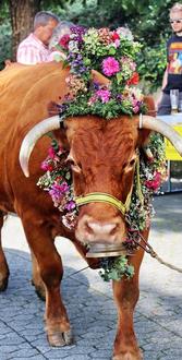 An der Grillhütte auf dem Hähnchen wurden derweil den Kühen von den Kuhführern sehr festlich wirkender grünbunter Kopf- und Halsschmuck angelegt. Die Ziegen und Ziegenböcke mussten das gleiche Procedere über sich ergehen lassen. Am Ende ein wunderschön farbenprächtiges Bild auf das die Besucher sich freuen konnten.