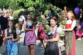Star des Festzugs war die mit einem aus Blumenschmuck gefertigten Kopfkreuz geschmückte Leitkuh, die von unserem Pfarrer Steffen Henrich geführt wurde.