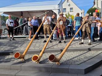 Was wäre ein Almabtrieb ohne begleitende Blasmusik?. Die dem Zug weit vorausgegangenen Biebesheimer Alphornbläser hatten dem Publikum mit der Kunst der Beherrschung ihrer voluminösen Instrumente das Warten schon verkürzt.