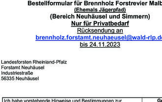 Rücksendung des Bestellformulars an brennholz.forstamt.neuhaeusel@wald-rlp.de mit Betreff „Brennholzbestellung Revier Malberg“ oder per Post an das Forstamt Neuhäusel.