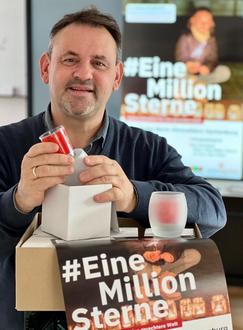 Rainer Lehmler mit den Windlichtern, die ab sofort gegen eine Spende für den guten Zweck erhältlich sind. Der Referent für Gemeindecaritas beim Caritasverband Westerwald-Rhein-Lahn freut sich bereits auf die Aktion „Eine Million Sterne“, die in diesem Jahr in Hachenburg stattfindet. Am Freitag, 1. Dezember, soll auf dem Alten Markt an der Pfarrkirche ein Zeichen der Solidarität und der Hoffnung auf Frieden und Gerechtigkeit gesetzt werden.