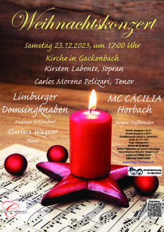 Auch in diesem Jahr wird wieder ein Konzert mit erfolgreichen und teils professionellen Akteuren angeboten. Die Limburger Domsingknaben und der Männerchor CÄCILIA Horbach werden ein abgestimmtes weihnachtliches Programm, aus verschiedenen Genres, präsentieren, bei dem die Zuhörerschaft auf ihre Kosten kommt. Die Horbacher Sopranistin Kirsten Labonte und ihr Ehemann Tenor Carlos Moreno Pelizari bereichern das Programm maßgeblich mit Solo- und Duett-Aufführungen. Beide Künstler sind derzeit feste Ensemblemitglieder am Musiktheater in Regensburg. Kirsten Labonte studierte an der Hochschule für Musik Detmold Gesang, Gesangspädagogik bei Prof. Gerhild Romberger und Liedgestaltung bei Prof. Manuel Lange. Ihr musikalisches Wirken startete am Landestheater Detmold, wo sie mit dem Detmolder Theaterpreis (Nachwuchspreis und Preis als Beste Sängerin im Musiktheater) ausgezeichnet wurde. Danach war sie an den Landesbühnen Sachsen engagiert und ist derzeit festes Ensemblemitglied am Theater Regensburg. Zu ihren Rollen gehören ua. Königin der Nacht (Die Zauberflöte), Ännchen in (Der Freischütz), Gilda in (Rigoletto) und aktuell Zerbinetta in der Oper „Ariadne auf Naxos“ von Richard Strauss. Tenor Carlos Moreno Pelizari wurde in Santiago de Chile geboren und studierte bei Prof. KS Wolfgang Millgramm an der Folkwang Universität der Künste in Essen. In der Spielzeit 2014/15 war er als Ensemblemitglied am Landestheater Detmold engagiert. Anschließend wechselte er in das Saarländische Staatstheater in Saarbrücken. Gastengagements führten ihn u.a. an zahlreiche Theater. Magdeburg, Luzern, Heidelberg, Osnabrück, Lübeck und an die Landesbühnen Sachsen. Er war festes Ensemblemitglied am Theater Aachen. Der Opernsänger verkörperte ua. Tamino in (Die Zauberflöte), Alfredo in (La Traviata), Don José in (Carmen), in „Candide“ von Leonard Bernstein, wo er die Rolle des Namensgebers Candide übernahm. Die Limburger Domsingknaben machten bereits kurz nach der Gründung im Jahre 1967 durch Bischof Dr. Wilhelm Kempf auf sich aufmerksam. Das Singen im Dom, bei auswärtigen Konzerten oder Opernauftritten, sowie die Reisen und das Kennenlernen fremder Kulturen sind den Jungen des Chores eine wichtige Motivationsquelle. Chorleiter Andreas Bollendorf war von 1979 bis zu seinem Abitur Limburger Domsingknabe. Nach Studium und beruflichen Stationen am Dom in Mainz und Münster ist er seit 2015 Leiter der Limburger Domsingknaben und Domkantor am Limburger Dom. Der Männerchor Cäcilia Horbach ist mit seinem mehrfach ausgezeichneten Chorleiter Jürgen Faßbender - seit 2016 musikalischer Leiter - und den derzeit knapp 30 ambitionierten Sängern, seit vielen Jahren sehr erfolgreich. Er kann auf beachtliche Erfolge im In- und Ausland zurückblicken und ist auch ein Zentrum leistungsorientierten Chorsingens im Westerwald. Der Chor wird mit zwei Blöcken weihnachtliche Chormusik, teils begleitet von den Solisten und Klavier, das Konzertprogramm gestalten. Andreas Bollendorf mit seinen Domsingknaben werden aus ihrem reichen Repertoire ebenfalls mit zwei Konzertblöcken die Zuhörer mit ihrem einzigartigen Klang in den Bann ziehen. Am Piano werden die Solisten und auch einige Chorwerke von der studierten Pianistin Clarissa Wagner begleitet. Sie pflegt eine besondere Verbindung mit den Limburger Domsingknaben. Auf eine kurzweilige Moderation von Miriam Pehl können sich die Besucher freuen. „Mit diesen hochkarätigen Konzertpartnern werden wir wieder neue Facetten in die Tradition der erfolgreichen Weihnachtskonzerte in der Gackenbacher Kirche bringen und unser treues Publikum begeistern.“ lautet die Zusammenfassung der Konzeption des Vorstandes. Die Sänger sind auch der Meinung, Konzertkarten können als Weihnachtsgeschenk überraschen und einen unvergesslichen Konzertabend bescheren. Detaillierte Infos zum Konzert gibt es auf den Flyern und auf der Homepage: www.mgv-horbach.de. Die Tickets, mit fester Platzbuchung in zwei Kategorien (21 € und 18 €, für Schüler und Studenten werden Vergünstigungen angeboten), sind im Ticketshop auf der Homepage des Vereins erhältlich und können auch telefonisch 06439 57107 oder per Mail kartenservice@mgv-horbach.de bestellt werden. Erstmalig wird auch eine Kinderbetreuung für Kinder 2 - 8 Jahre im benachbarten Pfarrheim angeboten. Anmeldungen per Mail an kartenservice@mgv-horbach.de