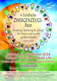Am kommenden Sonntag ab 14.00 Uhr öffnet der Eschelbächer Zwergenzeugsbasar zum vierten Mal seine Pforten. An vielen schönen Ständen wird wieder tolle Kinderkleidung und prima Spielzeug angeboten. Wer guter Hoffnung ist, dem öffnen sich die Türen auch gerne etwas früher. Für das leibliche Wohl ist bestens gesorgt.