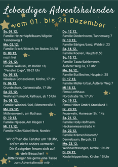 in diesem Jahr haben sich ganz viele Gastgeber gefunden, die ein Adventsfenster unseres „Lebendigen Adventskalenders“ gestalten und Licht in die abendliche Dunkelheit bringen. Jeder auf seine Weise, sodass eine abwechslungsreiche, leuchtende Adventszeit in Niederelbert stattfindet, die mit Nachbarn, Familie und allen Niederelbertern erlebt werden kann. Die Gastgeber investieren viel Freude, Herzblut und Zeit in die Gestaltung. Daher besucht die Fenster zahlreich, so wird der Adventskalender lebendig.
