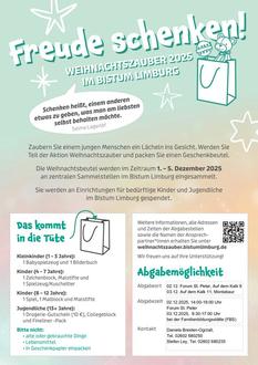 Die Aktion, die für viele strahlende Kinderaugen sorgt, findet weiter ihre Fortsetzung. Ziel der Aktion Weihnachtszauber ist es, bedürftigen Kindern und Jugendlichen eine Freude zu machen; denn auch im Bistum Limburg leben viele Familien mit Kindern und Jugendlichen, denen es finanziell nicht so gut geht. Sichtbar wird dies für die Betroffenen vor allem an Weihnachten, wenn Klassenkameraden und Freunde von ihren großen Weihnachtsgeschenken berichten.