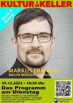 Adventszeit wird allgemein mit besinnlicher Weihnacht im Zusammenhang gesehen. Im Historica-Gewölbe ist am krummen Dienstag, den 5. Dezember Spannung angesagt. Ein Opernsänger, der Krimis schreibt ist zu Gast. Um was geht es? Ein grausamer Mord in der Laienchorszene, Bachs 'Matthäuspassion' und Kölsche Szenekneipen, sowie ein Ermittler, der von seinen eigenen Dämonen verfolgt wird! Der erste Krimi des Opernsängers Markus Francke verbindet Verbrechen und Hochkultur, Begeisterung und Besessenheit, Kölsches Lokalkolorit und die Musik Johann Sebastian Bachs zu einem facettenreichen Gesamtbild. Bereits während des Studiums begann Markus Francke seine Konzertlaufbahn und hat sich ein weit gefächertes Repertoire erarbeitet. So hat er in den vergangenen Jahren u.a. Verdis „Requiem“ in der Philharmonie Köln, Bachs „Johannespassion” in Helsinki mit dem Helsinki Baroque Orchestra, Bruckners „Te Deum” in Moskau mit dem Moscow State Symphony Orchestra, Bachs „H-Moll-Messe” in Budapest mit dem Hungarian National Philharmonic Orchestra und Luigi Nonos „Prometeo“ in der Philharmonie de Paris und in der Tonhalle Zürich gesungen. Im Kulturkeller präsentiert er nun seinen ersten Krimi und zeigt sich von einer ganz anderen Seite. Beginn ist 19:30 Uhr im historischen Gewölbe an der Stadtmauer in Montabaur. Der Eingang ist Ecke Kolpingstraße/Hospitalstraße zu finden. Karten gibt es an allen Vorverkaufsstellen oder direkt über Ticket Regional, www.ticket-regional.de/kultur-im-keller und natürlich an der Abendkasse zum Preis von 13 €. Die freundliche Tiefgarage Süd und der Parkplatz „Kalbswiese“ stehen allen Besuchern ab 17:00 Uhr kostenfrei zur Verfügung.
