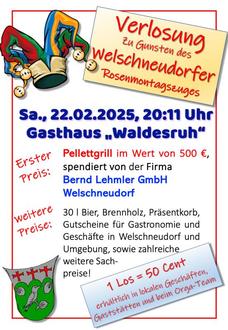 Am Samstag, 22.02.25, findet ab 20.11 Uhr im „Gasthaus Waldesruh“ in Welschneudorf die diesjährige Verlosung zu Gunsten des Rosenmontagszuges statt. Die Lose (Preis: Jeweils 0,50 €) sind ab sofort in den lokalen Geschäften und Gaststätten, oder über das Orga-Team erhältlich.