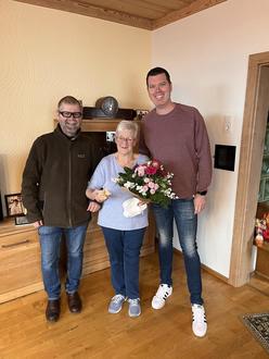 Bei einem nachfolgenden Besuch bei Irmgard Diel in der vorletzten Woche dankten Alexander Schmidt, Jörg Mattern und Marco Leicher für das langjährige Engagement von Irmgard für Horressen und überbrachten einen Blumengruß sowie eine "Ommez" in Broschenform.