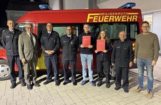 Gleich dreifachen Grund zum Feiern hatte die Freiwillige Feuerwehr Heiligenroth: Patrick Fries (3.v.l.) wurde in seinem Amt als Wehrführer bestätigt, außerdem wurden Joshua Bay (4.v.r.) und Cheyenne Celine Krebs (3.v.r.) zu Feuerwehrmännern bzw. -frauen ernannt. Es gratulierten (v.l.): Jens Weinriefer (VG-Wehrleiter), Andree Stein (Erster Beigeordneter und Brandschutzdezernent der VG Montabaur), Andreas Lehmann (stellvertretender Wehrführer Heiligenroth), Hans-Joachim Klimke (stellvertretender VG-Wehrleiter) und Alexander Herbst (Ortsbürgermeister Heiligenroth).
