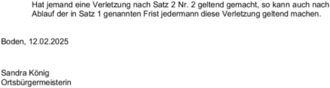 | 2. | vor Ablauf der in Satz 1 genannten Frist die Aufsichtsbehörde den Beschluss beanstandet oder jemand die Verletzung der Verfahrens- oder Formvorschriften gegenüber der Verbandsgemeindeverwaltung Montabaur, Konrad-Adenauer-Platz 8, 56410 Montabaur unter Bezeichnung des Sachverhalts, der die Verletzung begründen soll, schriftlich geltend gemacht hat. |