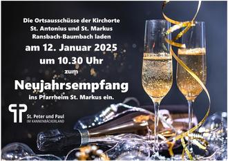Die Ortsausschüsse der Kirchorte St. Antonius und St. Markus Ransbach-Baumbach laden nach dem Sonntagsgottesdienst am 12. Januar 2025 um 10.30 Uhr zum Neujahrsempfang ins Pfarrheim St. Markus ein. Über Ihr Kommen würden wir uns freuen.