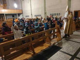 Neugierig und gespannt machten sich alle auf den Weg. Dort, in der Dunkelheit der Kirche, wurden sie vom Bischof Nikolaus empfangen. Leise erklang das Lied „Guten Tag, ich bin der Nikolaus“ zur Begrüßung. Mit großer Freude lauschten die Kinder der Erzählung der Nikolauslegende, bevor sie vom Nikolaus persönlich einen Schokoladennikolaus überreicht bekamen. Ihre strahlenden Gesichter und die herzlichen Dankesworte waren ein wunderschöner Moment.