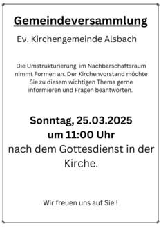 | 10:15 Uhr | Gottesdienst in Alsbach |
