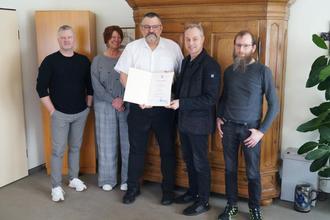 Zwar begann die berufliche Laufbahn bei der Verbandsgemeinde Ransbach-Baumbach erst 2002, doch da die vorherige Bundeswehrzeit zum öffentlichen Dienst hinzuzählt, wurde jetzt das Vierteljahrhundert erreicht. Seinerzeit erfolgte zunächst die Weiterbildung zum Vollstreckungsbeamten und der Einsatz bei der Verbandsgemeindekasse. Auch in späteren Jahren blieb Ruwen Herbel der Finanzabteilung treu. Nunmehr ist er seit einigen Jahren fester Bestandteil unseres Steueramtes und dort nicht mehr wegzudenken. Seit vielen Jahren engagiert er sich zudem im Personalrat der Verwaltung. Zum Dienstjubiläum überreichte Bürgermeister Michael Merz die Dankurkunde der Verbandsgemeinde Ransbach-Baumbach sowie ein kleines Präsent. Der stellvertretende Fachbereichsleiter „Finanzen“, Alexander Grün (re.), wohnte der kleinen Feierstunde ebenso bei wie Büroleiter André Heuser (li.) sowie Silke Winterwerber als Vertreterin des Personalrates.