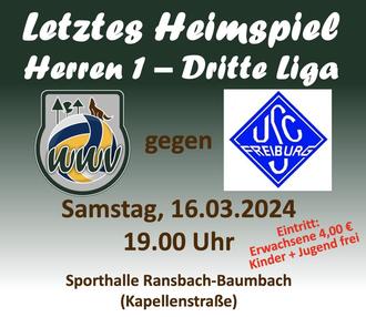 Die Herren 1 der Westerwald Volleys laden zum letzten Heimspieltag in der Dritten Bundesliga ein. Als Gegner wird der USC Freiburg erwartet, welche punktgleich, aber mit einem gewonnenen Satz mehr auf der Habenseite, auf dem 5. Tabellenplatz rangiert. Es darf also ein äußerst spannendes Spiel erwartet werden. Alle Volleyballfans der Region sind herzlich am Samstag, den 16.03.2024, um 19.00 Uhr in die Sporthalle Ransbach-Baumbach (Kapellenstraße) eingeladen, das letzte Heimspiel der Saison zu genießen und das Team um Trainer Alexander Krippes anzufeuern. (Eintritt Erwachsene 4,00 € - Kinder und Jugendliche frei)