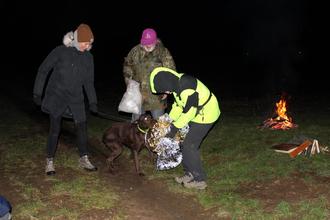 Pünktlich um 18:00 ging es los. Die Welpen machten den Auftakt und starteten bei Dämmerung am Vereinsgelände des HSV Ransbach- Baumbach e.V. Einmal rund um das Feld von Bauer Zöller führte der Parcour der diesjährigen Nachtübung vorbei an verschiedenen Stationen. Jede Station mit einem kleinen Feuerchen ausgestattet, hielten sie noch so manch andere Überraschung bereit. Hier klapperte es, da raschelte es, wieder Einer mit lauter Musik, etwas Knisterfolie und ein Anderer mit langem Mantel und Regenschirm. Im Dunkeln sieht, hört und riecht so mancher Hund seine Umwelt ganz anders, als bei Tageslicht. War es für die Welpen ein großes Abenteuer, waren die Junghunde schon etwas geübter. Die älteren Hunde sahen es eher als Spaziergang mit willkommener Abwechslung an. Da machte sich wieder einmal mehr das regelmäßige Training bemerkbar. Mit einem sicheren Hund geht es sich einfach entspannter spazieren, als mit einem ängstlichen Hund, der sich zum Beispiel durch das rascheln gelber Säcke am Straßenrand verschrecken lässt. Oder beim Anblick von Leuten mit Regenschirm im finstern stiften gehen möchte.