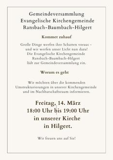 | 18 Uhr | Gemeindeversammlung in der ev. Kirche in Hilgert |