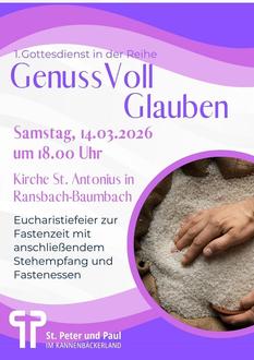 | 18:00 Uhr | GenussVoll Glauben: Eucharistiefeier zur Fastenzeit - anschließend Stehempfang und Fastenessen / 2. Jahramt für Stefan Schwaderlapp / 1. Jahramt für Walter Stoffels sowie verstorbene Angehörige |