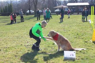 Nach der Theorie ging es zusammen mit Charly auf den Hundeplatz. Auch in diesem Seminar wurde wieder die These getestet, ob Hunde wirklich schneller sind. Und das Ergebnis: es macht absolut keinen Sinn vor einem Hund wegzurennen. Aber nebeneinander gehen ist ja auch viel schöner. Damit kam der nächste Teil auf dem Trainingsplatz, der Hindernissparcour. Bei sonnigem Wetter wurde eine kleine THS (Turnier Hunde Sport) Einheit ausprobiert. So konnten die Kinder nacheinander Charly um Slalomstangen führen, über eine Hürde schicken, das Kommando Sitz geben und aus Spaß an der Freude noch einmal Pfötchen geben lassen für ein Leckerli.