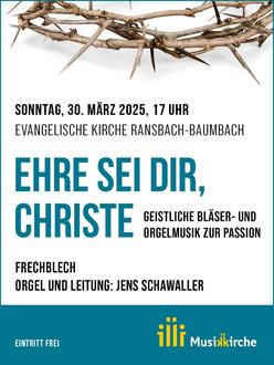 Die Musikkirche lädt am Samstag, 30. März um 17 Uhr in Musikkirche, Kirchstraße 13 in 56235 Ransbach-Baumbach zum diesjährigen Passionskonzert von FRECHBLECH ein. Unter dem geistlichen Motto „Ehre sei dir, Christe“ erklingt polyphone Musik nachdenklichen bis ernsten Charakters von der Renaissance über das Barockzeitalter bis hin in die Romantik und in die zeitgenössische Tonsprache. Die Gesamtleitung obliegt Dekanatskantor Jens Schawaller, nähere Informationen unter http://musikkirche.de. Der Eintritt ist frei.