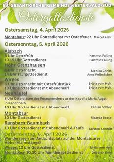 | 06:00 Uhr | Osternacht in der ev. Kirche mit Pfarrerin Monika Christ |