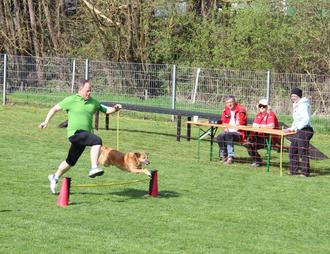 Der Plan stand und wurde konsequent verfolgt auf dem THS-Turnier beim HSF Dernbach e.V. Die Mitglieder des HSV Ransbach- Baumbach e.V. gingen am Samstag, 06.04.2024 hoch motiviert an den Start und zogen durch. Allen voran war wie immer die Jugend. Direkt zu Beginn beim Geländelauf belegten Franziska Dudeck (14 J.) mit Australian Shepherd „Bea“ den 1. Platz (weiblich Jugend) im 1 km Lauf, Lotta Nengelken (12 J.) mit amerikanischem Collie-Großpudelmix „Leo“ den 1. Platz (weiblich Jugend) im 2 km Lauf und Miriam Schenkelberg mit Mischling „Siwa“ den 1.Platz (w. Erw.) im 5 km Lauf. Im darauffolgenden Dreikampf (DK) schaffte es L. Nengelken mit „Leo“ erneut auf den 1.Platz (w. J.) mit 133 P. und Silke Pook-Sesterhenn mit Flat Coated Retriever „Caroline“ belegte ebenfalls Platz 1 (w. Erw.) mit 188 P. Musste S. Pook- Sesterhenn mit „Caroline“ in der letzten Saison noch mit Leine starten, klappte es dieses Jahr ohne Leine einwandfrei. Im Vierkampf (DK plus Unterordnung) Leistungsklasse 1, lag die Messlatte nicht weniger hoch. Hing die Unterordnung (UO) punktemäßig bei dem ein oder anderen unterm gewünschten Ziel, so konnte das bei Hürden-,Slalom- und Hindernislauf wieder ausgeglichen werden. Bei Erststarterin Heidi Weber mit Aussiedoodel „Jesper“ war es der Nervosität über die Premiere geschuldet. Dies übertrug sich natürlich von Frauchen auf den Hund und kostete Punkte in der UO. Trotzdem Platz 1 (w.,Senioren) mit 113 Punkten in der Gesamtwertung. Weitere 1. Plätze gab es für Tino Tendyck mit Mischling „Nia“ für 175 P. (m, ab 35 J.), Kathrin Goeth mit Australian Sheperd „Torvi“ für 231 P. in der Gesamtwertung und erfolgreiche 55 P. in der UO (w, ab 35J). Bei der Jugend belegten L. Nengelken mit Bordercolli-Großpudelmix „Loki“ den 1. Platz ( w, J.) mit 255 P. in der Gesamtwertung, sicherte sich somit die Qualifikation für die Leistungsklasse 2 und F. Dudeck mit Austrailian Shepherd „Ivar“ Platz 2 (w.J.). Desweiteren belegten im VK 1 Miriam Schenkelberg mit Siwa den 3. Platz (w, ab 35 J.) und Tabea Blanke mit Tervueren „Arko“ den 5.Platz (w, ab 19 J).