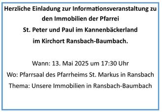 Die Jahresabschlüsse zum 31.12.2023 für die Körperschaft und Fonds der Katholischen Kirchengemeinde St. Peter und Paul im Kannenbäckerland wurden am 19.03.2025 durch den Verwaltungsrat genehmigt und können im Zentralen Pfarrbüro in Höhr-Grenzhausen vom 05.05.2025 bis zum 16.05.2025 während der Öffnungszeiten eingesehen werden.