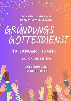 | 18.00 Uhr | Gründungsgottesdienst der Christusgemeinde Sayn-Wied Westerwald mit Neujahrsempfang in der Ev. Kirche Selters |