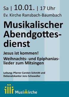 Die Musikkirche lädt am Samstag, 10.01. um 17:00 Uhr in die Evangelische Kirche, Kirchstraße 13 in 56235 Ransbach-Baumbach zum ersten Musikalischen Abendgottesdienst des Jahres 2026 mit Pfarrer Carsten Schmitt sowie mit Dekanatskantor Jens Schawaller und seinen Musikerinnen und Musikern ein. In dem kontrast- und spannungsreichen Singegottesdienst werden Weihnachts-, Neujahrs- und Epiphaniaslieder gesungen, die den Festkreis um Jesu Geburt herum kommentieren; zudem erklingen Kompositionen für Gitarre und Klarinette. Nach dem Gottesdienst werden wieder Kaffee, Tee und Kekse gereicht. Weitere Informationen unter http://musikkirche.de.