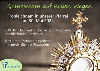 Berichte und Ankündigungen für das Verbandsgemeindeblatt KW 22, Erscheinungszeitraum 01.06. - 09.06.2024 bitte bis spätestens Montag 20.05.2024 einreichen. Messbestellungen und Veröffentlichungswünsche für das Pfarrblatt für Juni 2024 müssen bis spätestens Donnerstag, 16.05.2024 im Zentralen Pfarrbüro angegeben werden.