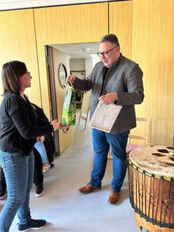 Das Abschiedslied sangen die Kinder und Erzieherinnen für unseren Pfarrer Michael Weber, der die Pfarrei ab Mai verlässt. Frau Schenke bedankte sich für seine tatkräftige Unterstützung an so manchen Festen, sowie die gute dreijährige Zusammenarbeit und überreichte ein selbstgebasteltes Geschenk der Kinder.