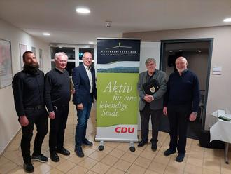 Die Mitglieder des Vorstandes des CDU-Gemeindeverbandes Jan Seeliger, Jochen Ickenroth, Wolfgang Zirfas und Roland Lorenz (v.l.n.r) danken Edmund Schaaf (r.) für seinen profunden Vortrag und seine Präsentation über die Einführung von wiederkehrenden Beiträgen für die Erneuerung von Ortsstraßen.