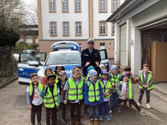 Aufgeregt und mit großer Vorfreude ging es zunächst für uns früh morgens von der Kindertagesstätte aus zur Bushaltestelle an der Stadthalle. Von dort ging es mit dem Bus nach Montabaur. Am Konrad-Adenauer-Platz in Montabaur angekommen, warteten wir gespannt auf den Polizisten, mit dem wir verabredet waren. Herr Hommrich von der Dienststelle in Montabaur begrüßte uns und gemeinsam machten wir uns auf den Weg zur Polizei. Unterwegs übten wir, wie man über eine Straße mit Fußgängerampel geht und über einen „Zebrastreifen“ die Straße überquert. Bei der Polizei haben wir uns die Uniform eines Polizisten angeschaut, woran man einen Polizisten erkennt und was ein Polizist an seinem Gürtel trägt.