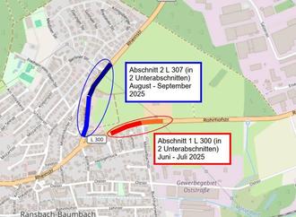 Im Abschnitt 1 wird der Bereich L300/Rohrhofstraße vom jetzigen Bauende (hinter der ED-Tankstelle) auf einer Länge von ca. 450 m in Richtung Ebernhahn für die Erneuerung der Fahrbahn und Rinnenanlagen abschnittsweise gesperrt.