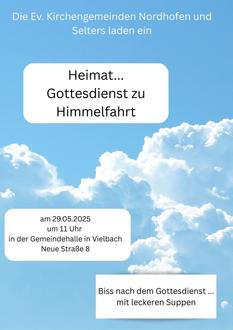 | 10.30 Uhr | Gottesdienst Christi Himmelfahrt im Nachbarschaftsraum in der Gemeindehalle Vielbach, Neue Strasse 8 |